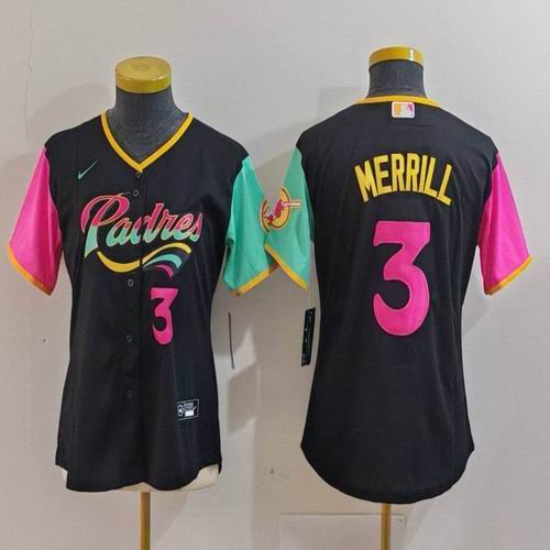 Women Nike San Diego Padres #3 Jackson Merrill black pink green baseball jerseys city version 02