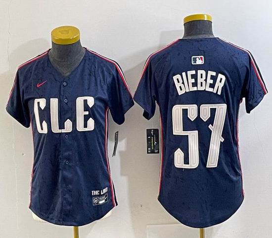 Women Nike Cleveland Indians #57 Shane Bieber blue majestic baseball jersey -BD